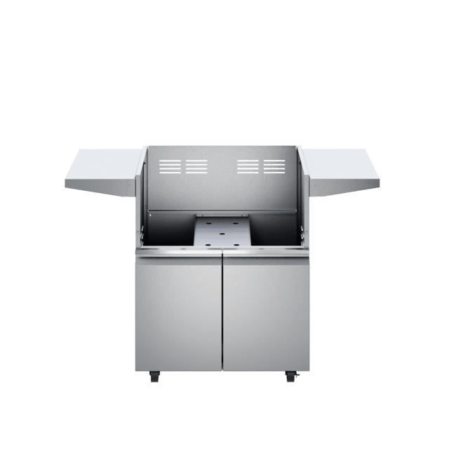 This integrated grill base offers portability and a freestanding option compatible with our 30 inch built-in grills, the Dine & Breakfast Club, and the Teppanyaki Griddle. It features convenient storage and two fold-down side shelves with tool holders. Use the heavy-duty casters to roll your grill into position and enjoy your favorite view while you cook.