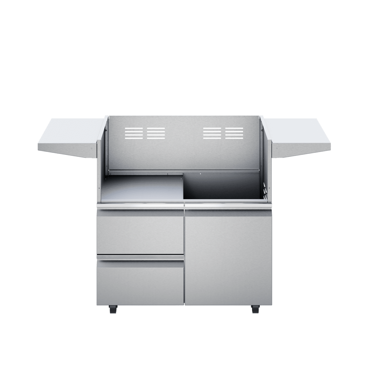 This integrated grill base offers portability and a freestanding option compatible with our 30 inch built-in grills, the Dine & Breakfast Club, and the Teppanyaki Griddle. It features convenient storage and two fold-down side shelves with tool holders. Use the heavy-duty casters to roll your grill into position and enjoy your favorite view while you cook.