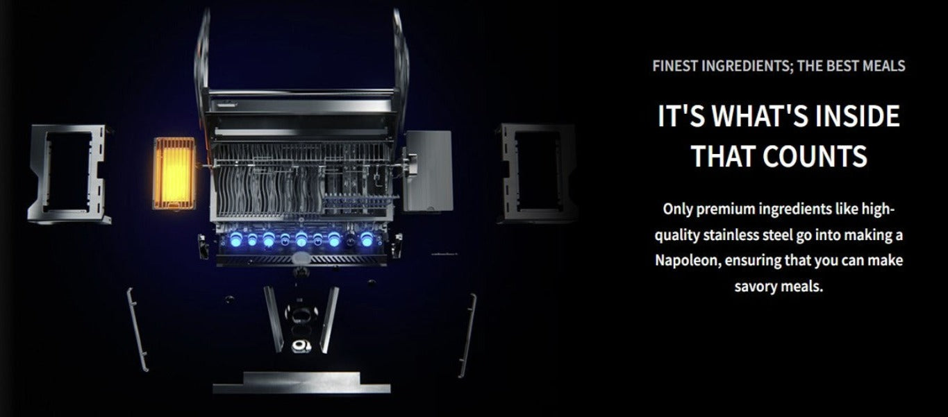 A gourmet outdoor kitchen deserves to have a big and beautiful grill. The Built-in Prestige PRO™ 665 Propane Gas Grill with Infrared Rear Burner features seven burners of grilling bliss. Durable stainless steel features chrome accents for luxury and durability. Grill after dark with LED Spectrum NIGHT LIGHT™ Control Knobs, with near limitless color possibilities. Additionally the SafetyGlow feature turns the lights red when a burner is in use. Know which burners are lit so you can get the perfect sear, or ideal indirect grilling temperature. The oven-like performance of this grill allows you to bake and roast with ease, sear over high heat, and the rear burner makes delicious rotisserie meals in no time. You'll know it's a Napoleon with the iconic WAVE™ cooking grids and proximity lighting. . The integrated smoker tube and dedicated burner can even turn this grill into a smoker, while interior lights let you grill well past dark. Perfect and professional, the PRO™ 665 Built-in Grill Head is the perfect grill for your outdoor kitchen.